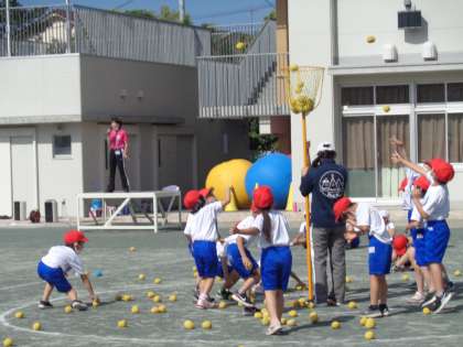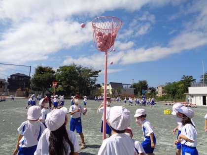 かごを狙って一生懸命投げ、1番多いクラスでは、70こ入りました。