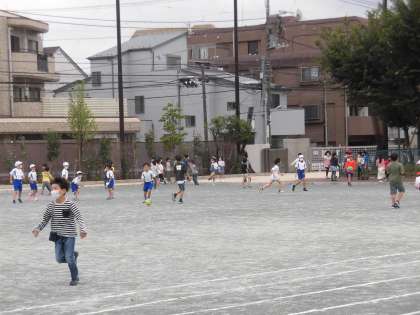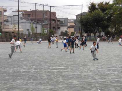 校庭で遊ぶ子ども達、行事の練習がスタートして