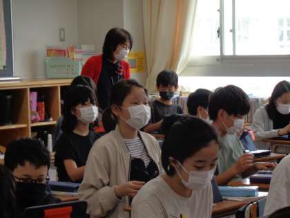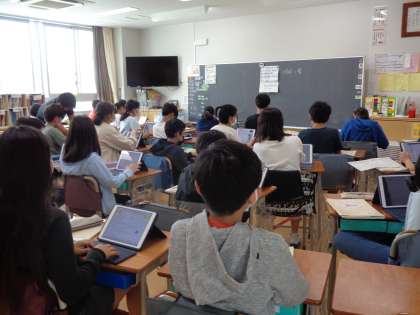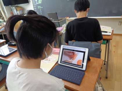 6年生の家庭科です。来週の調理実習に向けて、調理実習のサイトを見て、野菜の切り方や包丁の扱い方を学習していました。タブレットは、知りたいところを自分で選んで、手元で見ることができるので、より詳しく主体的に学ぶことができます。
