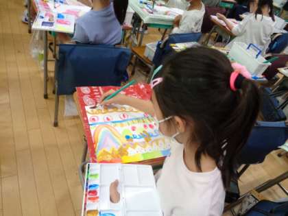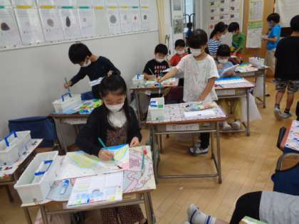 2年生が絵具を使って、自分だけの「えのぐじま」を描いていました。