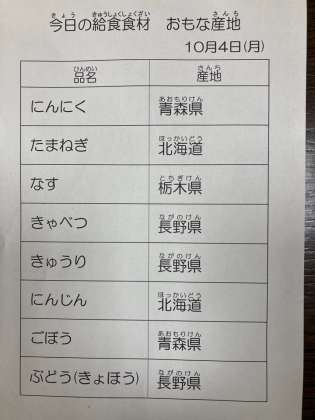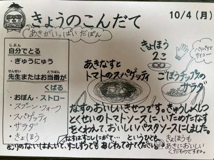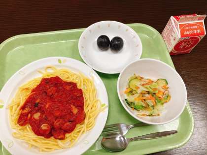 今日は、秋なすとトマトのスパゲッティ、ごぼうチップスのサラダ、巨峰、牛乳です。