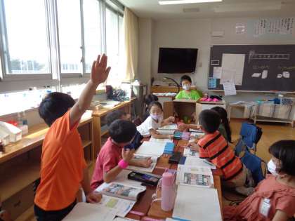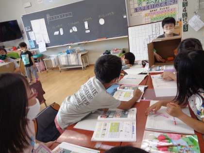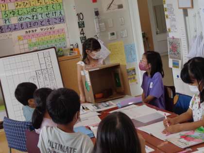 箱の中に入っている「かたち」の特徴を伝えて、それに合う「かたち」を選び、名前を言います。遊びのような活動を通して、「かたち」の概念を形成しています。とても楽しみながら、学ぶことができました。