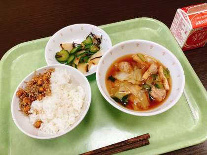 今日は、ごはん、大豆とじゃこの甘辛揚げ、肉団子汁、野菜の浅漬け、牛乳です。