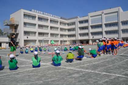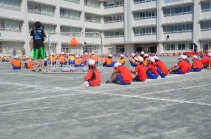 2年生の競技「ランドビ→」です。曲に合わせて、各チームが入場してきます。戦いが始まる感じがして、とってもかっこいいです。