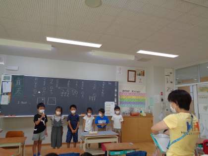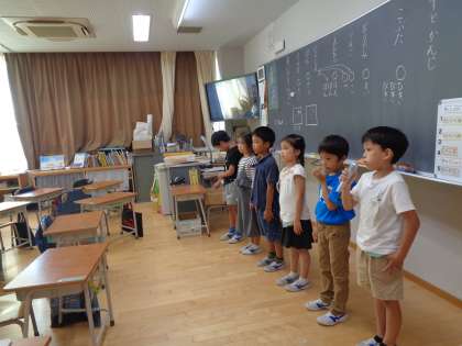 1年生の「はじめの言葉」の代表児童が、休み時間に練習をしていました。