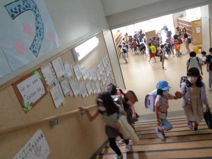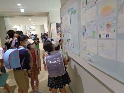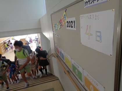 掲示板は、スポーツフェスタのカウントダウン、イラストクラブの絵、6年生の図工の作品が貼られています。