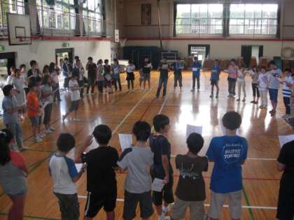 今日、明日の「山のキャンプ」に向けて、スタッフが体育館に集まり、