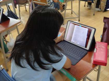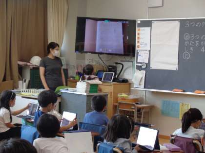 1年生にとって難しい作業ですが、操作に慣れてくると、友達の考えが一目で分かったり、自分の考えと比べられたりするので、より効果的に学習できます。