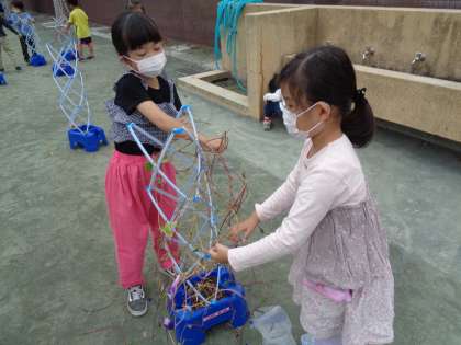 1年生があさがおのつるを支柱から外して、リースを作っていました。