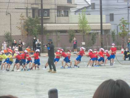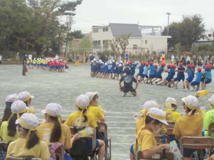 まずは3年生の競技「走ってひっぱれ☆KIZUNAつなひき」です。