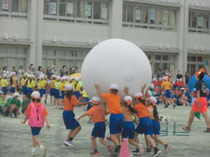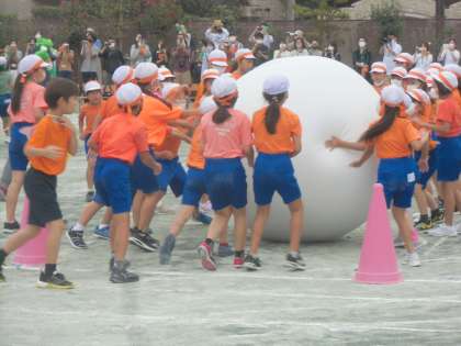 2列で並んでいる間を転がして通した後は、フラフープに乗せて運び、コーンを回ります。慌てずに運びたいけど、急いで運びたい!