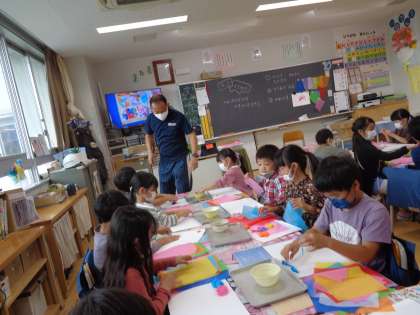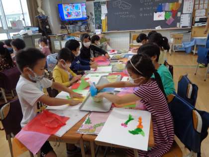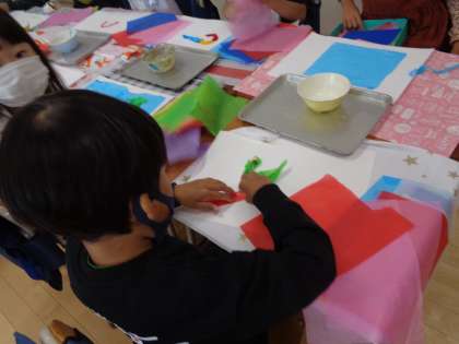 まるめたり、ちぎったり、かさねたりと、貼りながら形や色を工夫していきます。活動していきながら、自分のテーマが見つかり、真っ白い画用紙がどんどん彩られていきました。感触も気持ちよく、楽しんで活動できました。