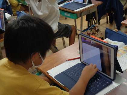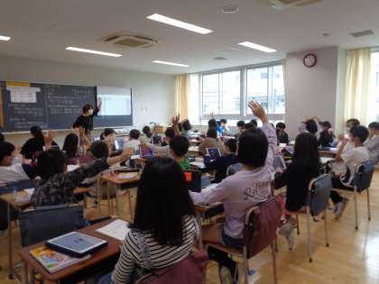 同じ広さで人数が違う、違う広さで人数が同じという3つの部屋で、どの部屋が混んでいるのかを考えていました。この問題、解き方がたくさんあります。一人一人が自分の考えをノートに書き、ロイロノートで考えを共有しました。たくさんの考えの中からより簡単で、早く解ける方法を考えていきます。考えていく過程が算数のおもしろさの1つです。