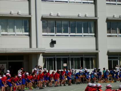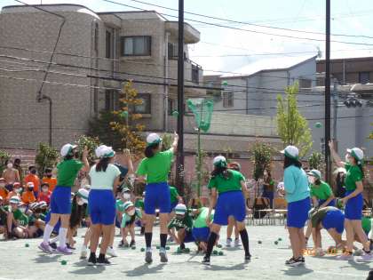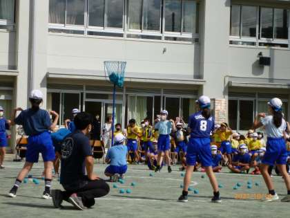 男子の後に女子が玉入れを行い、互いに相手が玉を入れているときは、先生ではなく自分たちでかごをおさえていました。チームによっては、先生も一緒に踊ってくれいていました。そして、自席で応援している5年生も6年生に合わせてノリノリで踊っている姿がほほえましかったです。