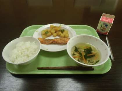 今日のメニューはご飯、鮭のねぎ味噌焼き、じゃがいもの煮付け、鶏肉と野菜のすまし汁、牛乳です。