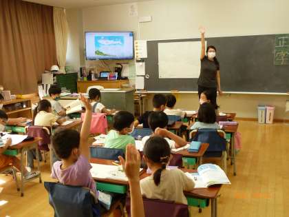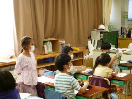 くじらぐもに子供たちが乗って空から自分たちの町を見下ろしたときに思ったことをワークシートに書き、隣の友達と伝え合っていました。その後、友達の意見の良かったところを全体でも交流しました。