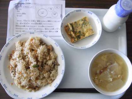 とりめし・牛乳・いろどり卵焼き・さつま汁