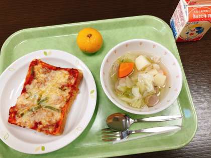 今日は、ピザトースト、ポトフ、みかん、牛乳です。