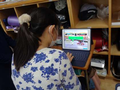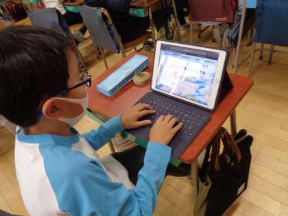 4年生の様子です。テストが終わった子からインターネットのアプリを使って、キーボードのタイピングの練習をしていました。画面に表示された言葉通りに文字を打ちます。ゲーム感覚で行え、やればやるほど上達します。