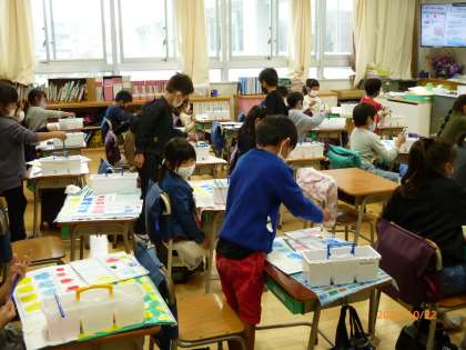 1年生は、いよいよ絵の具を使っての勉強が始まりました。