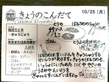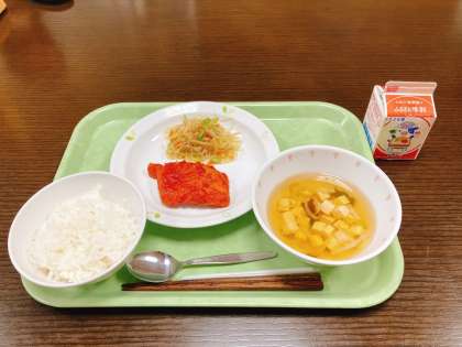 今日は、ごはん、鶏のチリソース、春雨の中華炒め、豆腐とわかめのスープ、牛乳です。