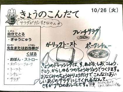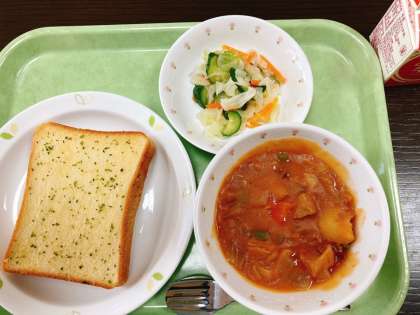今日は、ガーリックトースト、ポークシチュー、フレンチサラダ、牛乳です。