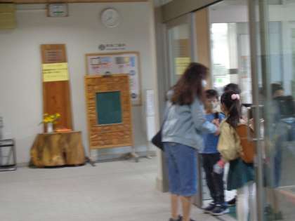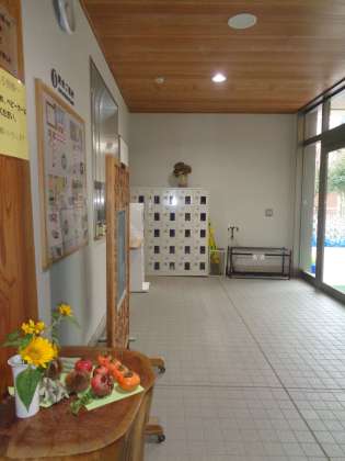 校庭の花壇に咲いていてヒマワリが折れてしまい、主事さんが気付いて花瓶に生けてくれました。秋の実りと並んで、夏から秋への移り変わりのようです。