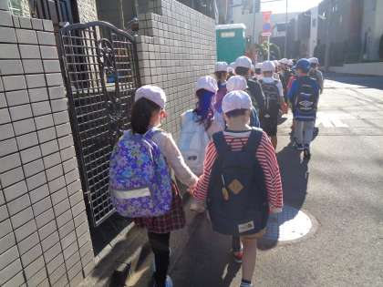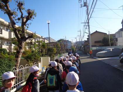 学校を出発して、公道を歩きました。「2列で広がらずに間を開けずに歩くこと」というやくそくをしっかりと守って歩いていました。