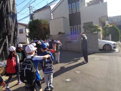 6クラスという大人数で、長い列になりましたが、本当によくまとまっていて素晴らしかったです。横断歩道でも手を挙げて渡ったり、自動車や自転車が来ると止まったりと子供たちに交通安全の意識が身に付いていることが分かりました。