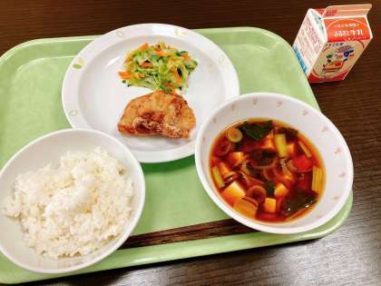 今日は、ごはん、鶏肉の塩麹揚げ、野菜のナムル、とうふのみそ汁、牛乳です。