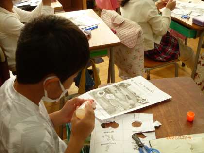 いろいろな種類の動物の言い方を練習した後、動物の絵カードを切って自分だけのオリジナル動物園を作ります。最後には、自分の動物園にいる好きな動物をみんなに紹介し合いました。