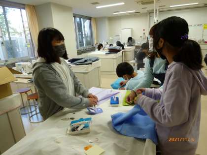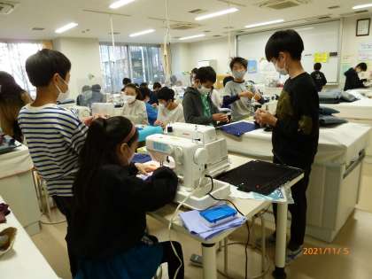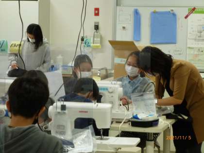 しつけ糸で印付けをしている子、ミシンで縫っている子、進度は様々ですが、みんな真剣な顔で取り組んでいました。