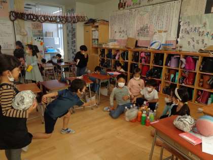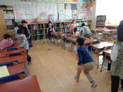 このクラスはボーリング屋さんです。だいぶ出来上がってきたので、試してみました。やってみると、ピンが倒れなかったり、ルールが曖昧だったりと、上手くいかないところがたくさんありました。グループごとに改善点を話し合って、次につなげます。