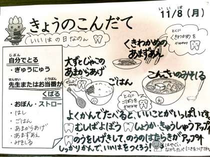 昨日は立冬、暦の上ではもう冬になりました。今日は、いい歯の日だそうです。11月は、ほぼ毎日いい何とかの日になっているみたいですけど。今日のかみかみメニューは、それを加味したのですね。「いい歯なんて、どうでもいいわ。」なんて言わずに、しっかり噛んでいただきましょう。