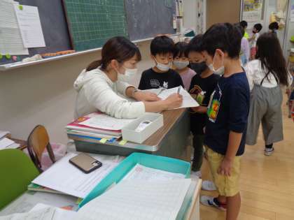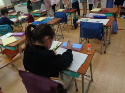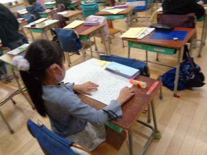 話のまとまりごとに行をかえて、最初の1マスをあけて書くなど、1年生にとってとても難しい学習でした。先生に見てもらって、何度も書き直しをして根気強く取り組みました。すべて書き終えたときは、達成感でいっぱいでした。