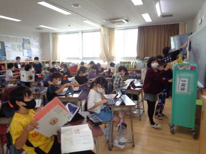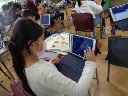 砧図書館から借りたたくさんの本から必要な資料を探し、ロイロノートにまとめました。自分が興味のあることを見付けたり、的確な情報を探し出したりすることは、根気がいる作業です。本をじっくり読んでまとめていました。