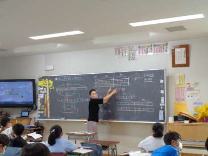 1mのテープを何等分したのか・・・1の単位に着目できるかが、鍵となります。黒板に描かれているテープ図をじっくり見て、「分かった!」と言っている子が何人もいました。