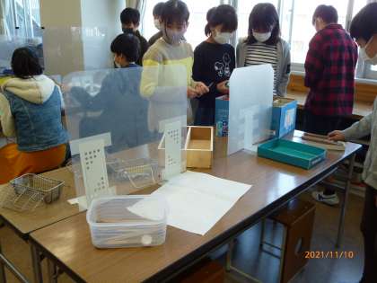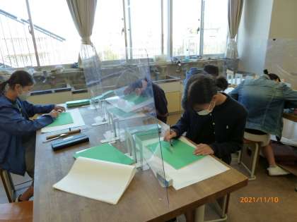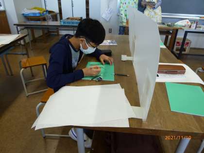 自分で選んだフォークやわりばしなどの道具で自由に線や模様を描いて版を作っていました。版が出来上がったら、インクをのせて半紙に刷っていきます。版を作るときに、ある程度の深さで彫れているかどうかが、大切なポイントです。