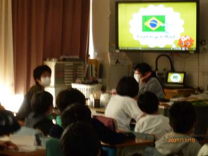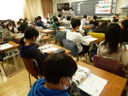 今日のテーマは、「自分の行きたい国と行きたい理由を知らせよう」でした。まずは、チャンツ(リズムがある歌のようなもの)で表現の練習や世界の国の名前を確認してから、英語ノートに自分の行きたい国を書き、発表していました。