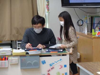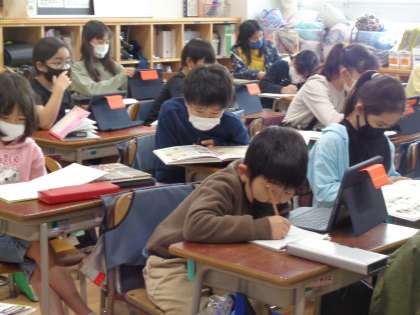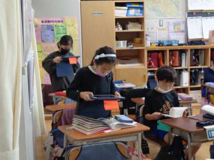 タブレットで調べているのかと思いましたが、本の中の必要な情報を写真で撮って、それを見てまとめていました。そうすることで、本をみんなで見ることができます。