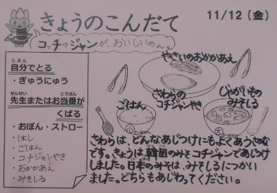 今日は日本の味噌を使った味噌汁と、韓国の味噌を使ったコチジャン焼きです。味噌の日韓饗宴ですね。コチ(コチュと表記されることもあります。)は唐辛子という意味で、ジャンは味噌を意味するそうです。甘味、辛味、うま味がミックスされた、おいしい味噌です。給食では辛味はおさえてありますが。