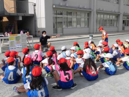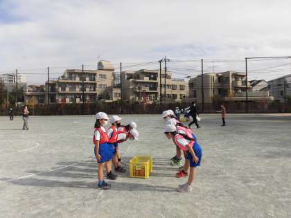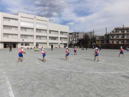 2年生の体育「ボール投げゲーム」の授業の様子です。