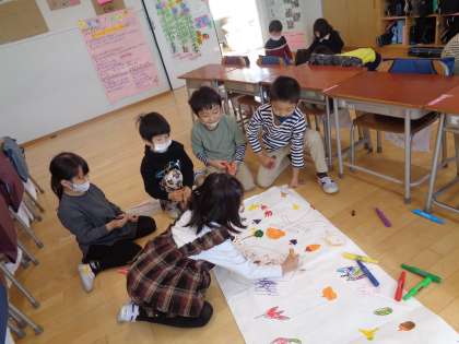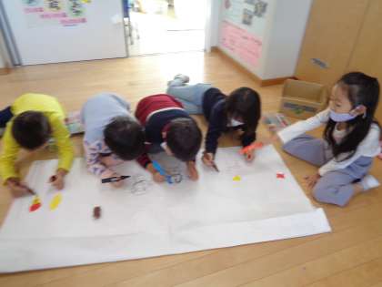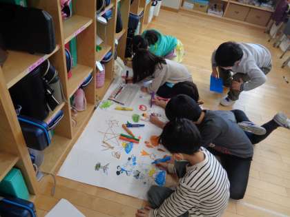 このクラスは、最後の仕上げをしていました。教室を楽しい絵でいっぱいにするそうです。