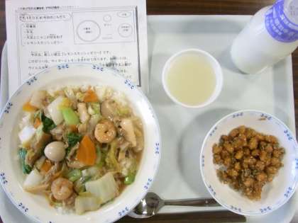 中華丼・牛乳・大豆とじゃこの甘辛あげ・レモンスカッシュゼリー