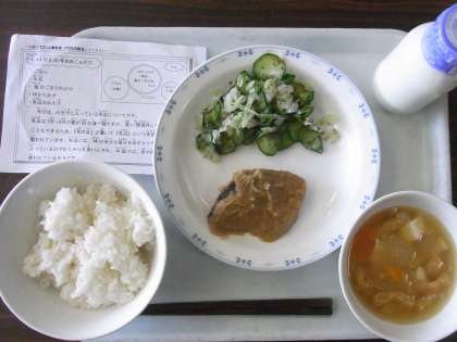今日は和食です。みそ汁に入っている冬瓜は、冬という文字を使っていますが、7〜9月が旬の食べ物だそうです。長い間保存がきき、冬にも食べることができるので、冬瓜となったといわれています。おいしく頂きました。