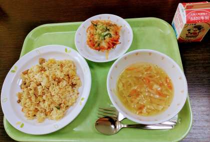 今日は、とりごぼうピラフ、ピザポテト、ジュリアンスープ、牛乳です。