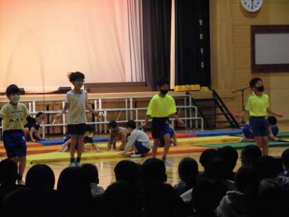 側転、開脚跳び、縄跳び、マットの技などを
