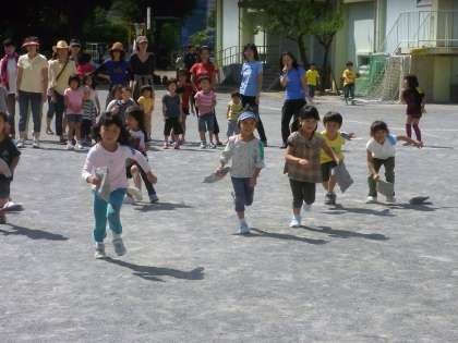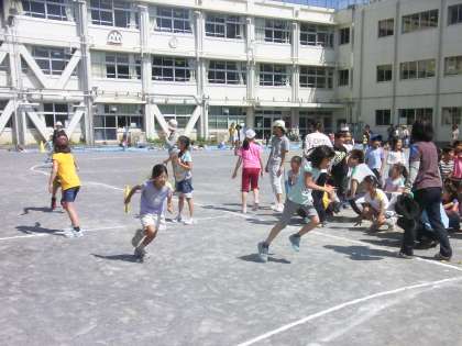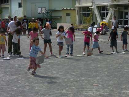 後半は幼児徒競争、全員リレー、宝つりです。小さい子どもたちも、ご褒美をもらえてとっても楽しそうです。全員リレーは大人も参加し、白熱の戦いです。低学年も1週走るので、結構大変です。最後は、全員がご褒美をもらえる宝つりです。校長ももちろん参加して、ご褒美を頂きました。ありがとうございます。