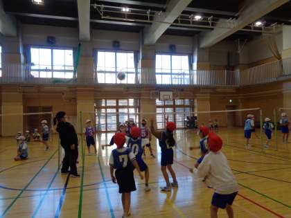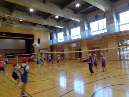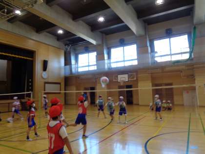 ネットを挟んだ相手のコートにボールを投げて、ボールが床に落ちたら、点数が入ります。はじめてネットを使ったゲームを行いましたが、とても楽しそうに運動していました。