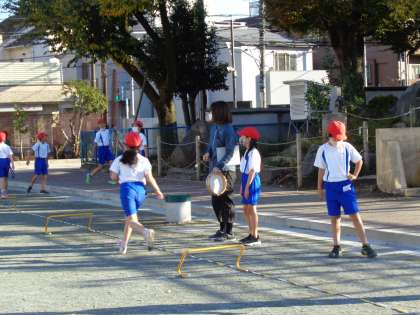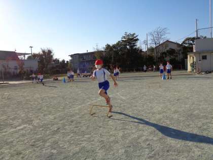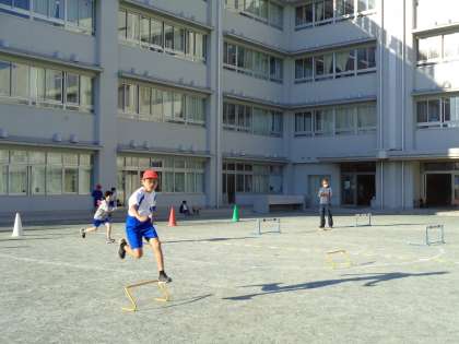 等間隔に並べられてハードルを連続で走り越しながら、仲間と競争したり、記録に挑戦したりして楽しみます。4年生では、「速さ」も大事なのですが、調子よくハードルを走り越えることで楽しさや心地よさを感じることを目指しています。